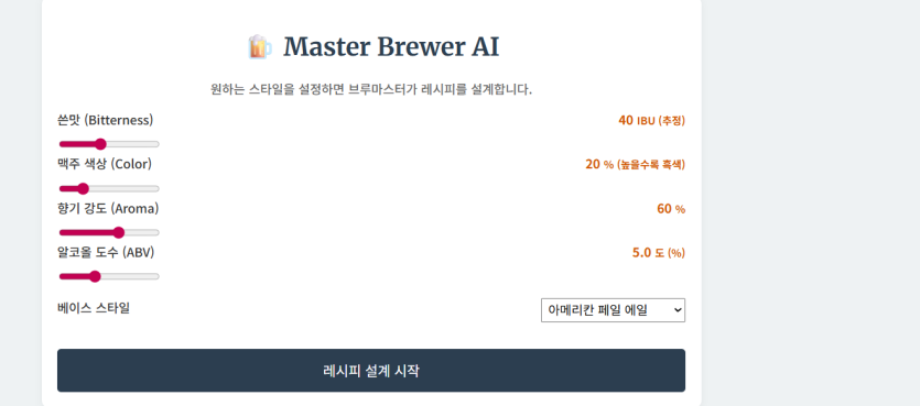 맥주 레시피 자동 만들기 작성자 정보 최고관리자 작성 작성일 2026.01.08 23:44 컨텐츠 정보 34 조회 목록 본문 레시피 생각 이젠 고민 끝 원하는 맥주를 선택하면 맛나게 레시피를 만들어 준다. 관련자료 이전 안주 생각 날떄 작성일 2026.01.08 23:46 다음 삼양주 만드는 방법 작성일 2025.12.09 21:44 댓글 0 등록된 댓글이 없습니다. 로그인한 회원만 댓글 등록이 가능합니다. 목록